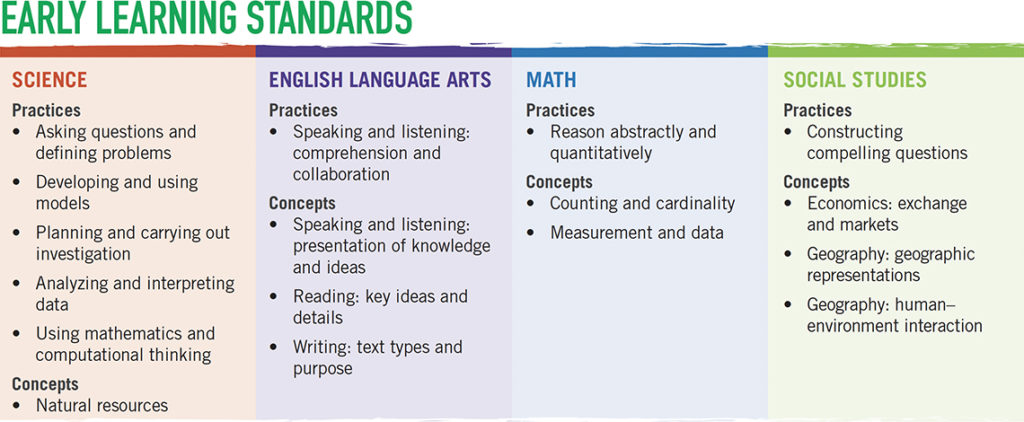 The activities connect with early learning standards in science, English language arts, math, and social studies—as well as programs like the National Association for the Education of Young Children (NAEYC), Head Start, and established nature-based preschool practices—so children learn concepts they need to succeed in school.
